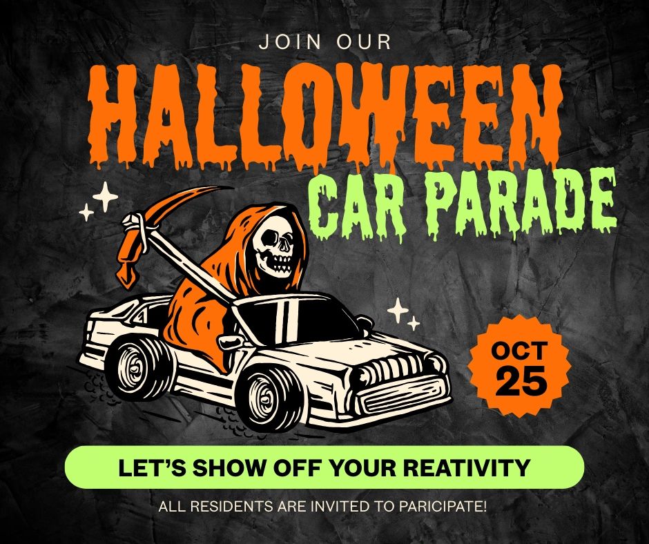 Hey Neighbors! Get ready for some spooky fun — our Halloween Car Parade is happening on Saturday, October 25th!